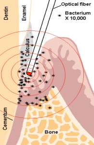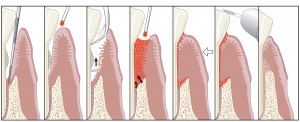 In LANAP surgery, a variable free-running pulsed neodymium:yttrium-aluminum-garnet (Nd:YAG at 1064 nm wavelength) dental laser is used by a trained and certified dentist or periodontist to treat the periodontal pocket. The laser energy selectively removes diseased or infected pocket epithelium from the underlying connective tissue. The necrotic epithelium is stripped from the connective tissue at the histologic level of the rete ridges. Since the laser energy is quite selective for diseased tissue, the underlying pleuropotential connective tissue is spared, thereby permitting healing and regeneration rather than formation of a pocket seal by long junctional epithelium.