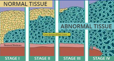 - Stage III: Shows abnormal surface tissue. This is when we can see it visually when we like carefully. Severe Dysplasia.